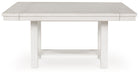 | Details | Made with rubberwood solids, ash veneer and MDF substrates, Antiqued white finish with grain texture, Tabletop with planked effect, Two 12" removable center leaves, Table extends to 86" overall by pulling both ends and dropping in leaves, Seats up to 8, Assembly required | |