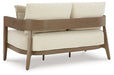 Elevate the appeal of easy-breezy living with this outdoor loveseat. Made to look like wood yet durable enough to weather the elements, it's sure to serve you and your besties well, year after year. The gently curved piece features cushions wrapped in Nuvella+™ high-performance fabric for plush refinement. Patterned accent pillows infuse delightful texture.