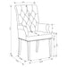 • Plushily padded side chairs are adorned with rolled backs and button-tufted upholstery with bold nailhead trim