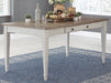 Set the scene for coastal chic or modern farmhouse living with this dining room table. Clean-lined, simply striking table doubles the charm with a brown tone top with plank effect, paired with a grayish white base with rub through effect for timeworn appeal. Multi-functional dining table features two convenient side drawers and a storage bin on each end for maximum use of space. Styled to comfortably seat six, this table makes room for one and all.