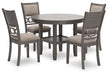 | Details | Includes dining table and 4 upholstered chairs, Table made with rubberwood solids, mindi veneer and MDF substrates, Chair made with solid wood and engineered wood, Light gray finish, Chair with light gray textured polyester upholstery, Foam cushioned seat and backrest, Chair backrest features fretwork accent, Tabletop has reverse diamond patterned veneer, Thick tapered legs, Lower shelf, Seats up to 4, Assembly required | |