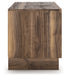 Nostalgic style, retooled for today’s trends. This TV stand with electric fireplace puts an elevated twist on mod aesthetics. Its warm brown tones reflect the mid-century vibes you love, while the angular base incorporates contemporary motifs. Integrated drawer handles round out the look in sleek style. For added ambiance, the electric fireplace brings a cozy-cool vibe to your living room. With the touch of a button, activate the LED-lit flame and adjust the temperature or the flame brightness. The flame effect includes multiple color options and a realistic-looking faux birch log set.